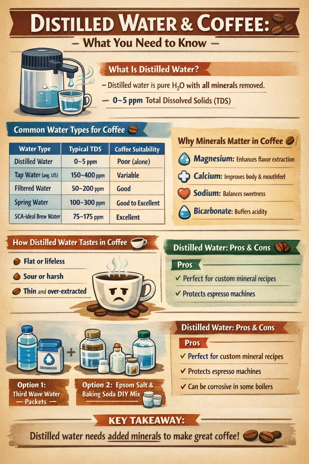 Ya, anda boleh membuat kopi dengan air suling — tetapi anda mungkin tidak boleh bergantung padanya secara eksklusif. Air suling adalah 100% H₂O tulen dengan semua mineral dikeluarkan , yang kedengaran sesuai untuk cawan yang bersih, tetapi pengekstrakan kopi sebenarnya bergantung pada mineral seperti magnesium dan kalsium untuk menarik sebatian perisa keluar dari bahan. Tanpanya, kopi anda mungkin terasa rata, masam atau kosong — dibancuh secara teknikal, tetapi tiada sesuatu. Walau bagaimanapun, air suling mempunyai tempatnya, terutamanya apabila dicampur dengan air yang kaya dengan mineral atau semasa anda bereksperimen dengan kawalan penuh ke atas bahan kimia minuman anda.