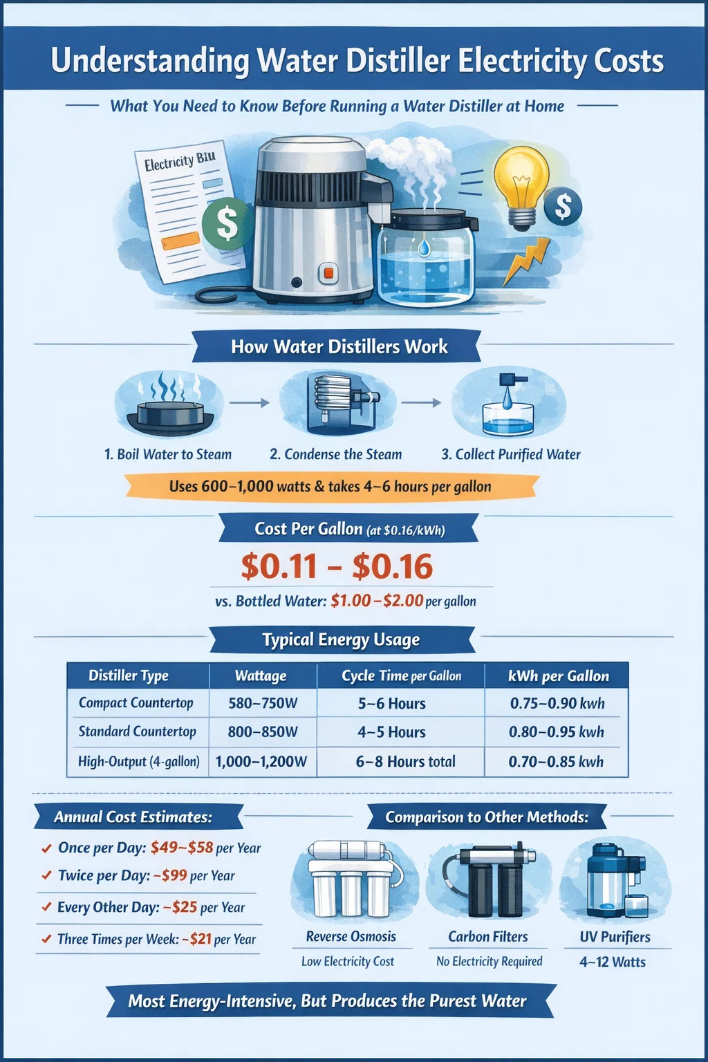Pada penggunaan biasa satu kitaran setiap hari, jangkakan untuk menambah $4 hingga $8 sebulan kepada bil elektrik anda. Itu ketara jika anda melihat perbelanjaan dengan teliti, tetapi ia berada dalam julat yang sama seperti menjalankan komputer meja selama beberapa jam setiap hari atau mengendalikan peti sejuk beku yang lebih lama. Ia tidak akan mengubah secara mendadak profil tenaga isi rumah anda melainkan anda menjalankan penyuling beberapa kali sehari.