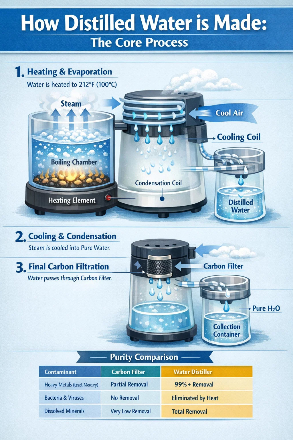 Untuk menjawab soalan secara terus: air suling dibuat melalui proses penyulingan haba , yang melibatkan air sumber mendidih menjadi wap dan kemudian menyejukkan semula wap itu kepada keadaan cecair dalam bekas yang berasingan. Kaedah ini berkesan meninggalkan sehingga 99.9% daripada jumlah pepejal terlarut (TDS) , termasuk mineral, logam berat, dan mikroorganisma, kerana bahan cemar ini tidak boleh bertukar menjadi gas pada takat didih air. Dengan menggunakan khusus penyuling air , anda mencipta semula kitaran hidrologi semula jadi—penyejatan dan pemeluwapan—dalam ruang terkawal untuk menghasilkan bentuk H2O paling tulen yang mungkin.