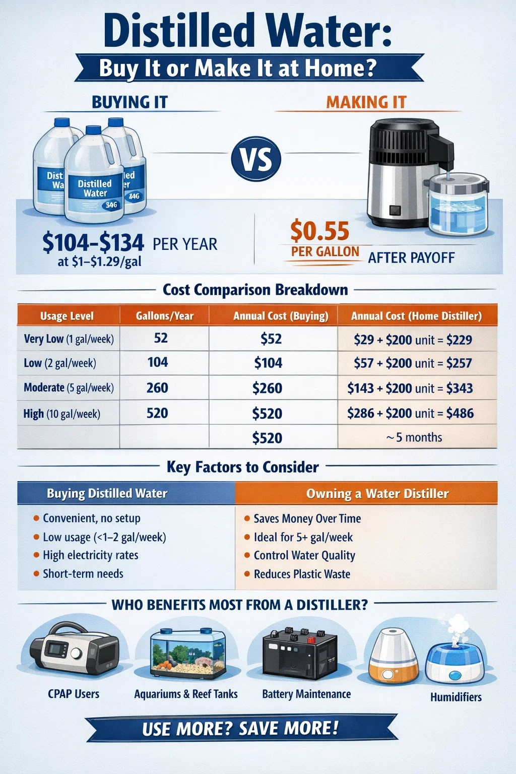 Pengeluar CPAP secara universal mengesyorkan air suling dalam ruang pelembap untuk mengelakkan pembentukan mineral dan pertumbuhan bakteria. Pengguna CPAP biasa mengisi ruang setiap malam — kira-kira 0.5 hingga 1 liter setiap penggunaan — memakan kira-kira 1 gelen (3.8 liter) seminggu. Itu 52 gelen setahun. Pada $1.00/gelen dari kedai, anda membelanjakan $52 setiap tahun hanya untuk air CPAP. Dengan penyuling air yang beroperasi pada harga $0.50/gallon all-in, anda membelanjakan $26/tahun untuk air CPAP selepas bayaran balik. Sepanjang tempoh 5 tahun pada penyuling $200, jumlah kos penyulingan rumah untuk CPAP sahaja mencapai lebih kurang $330 berbanding $460 untuk dibeli di kedai — kira-kira 30% penjimatan. Jika anda juga menggunakan penyuling untuk tujuan lain, kompaun penjimatan cepat.