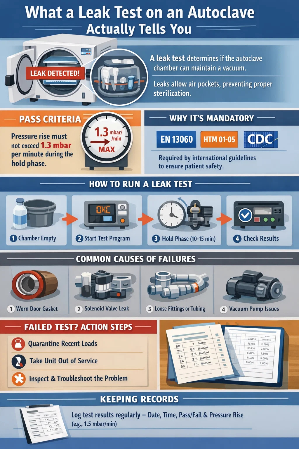 Di luar pematuhan, terdapat sebab mekanikal langsung. Kitaran autoklaf pergigian pra-vakum berfungsi dengan menarik satu siri denyutan vakum untuk mengeluarkan udara sebelum stim disuntik. Jika ruang bocor, udara sisa membentuk poket penebat di sekeliling instrumen. Suhu wap pada permukaan instrumen mungkin membaca dengan betul pada penderia, tetapi suhu sentuhan sebenar dalam poket udara tersebut boleh 5°C hingga 15°C lebih rendah daripada bacaan sensor ruang , yang cukup untuk membiarkan penunjuk biologi tidak dicabar dan patogen berdaya maju.