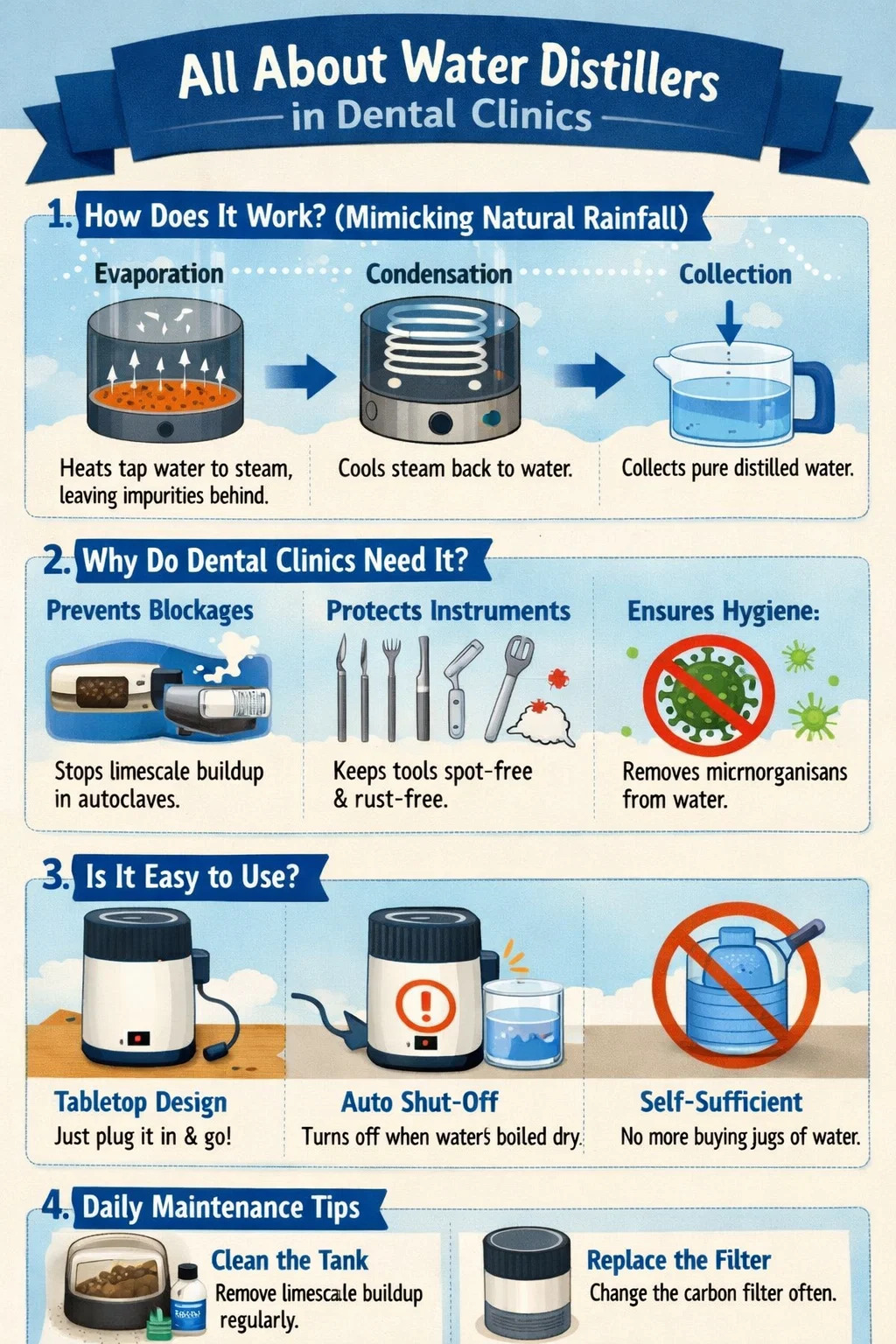 Melindungi instrumen: Air yang mengandungi kekotoran boleh meninggalkan bintik putih atau karat pada instrumen pergigian pada suhu tinggi, memendekkan jangka hayat instrumen.