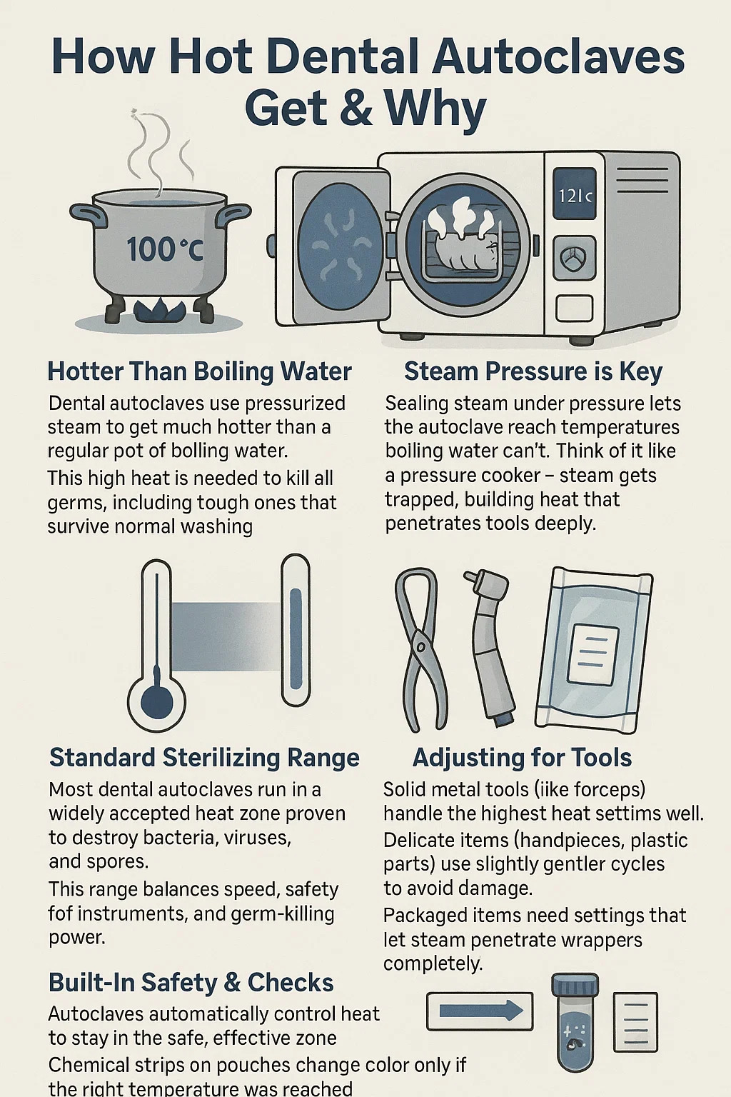 Kebanyakan Autoklaf Pergigian Jalankan di zon haba yang diterima secara meluas terbukti memusnahkan bakteria, virus, dan spora.